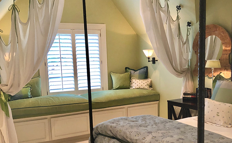 A redesigned bedroom space for a returning college daughter, as well as a room doubling as a guest suite. Client wanted to showcase the vaulted ceiling and add custom built-ins for storage.