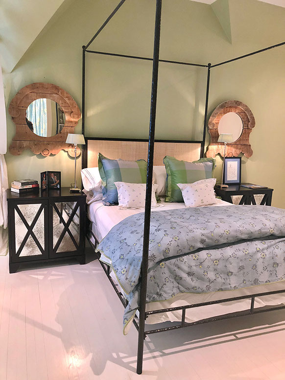 Painted white hardwood floors lend an inviting charm and showcase the iron framed bed and shabby chic decor. The bathroom is playful and clean with the patterned glass tiles and custom vanity and shower curtain.