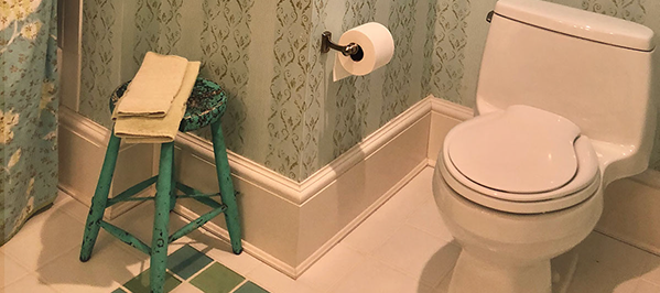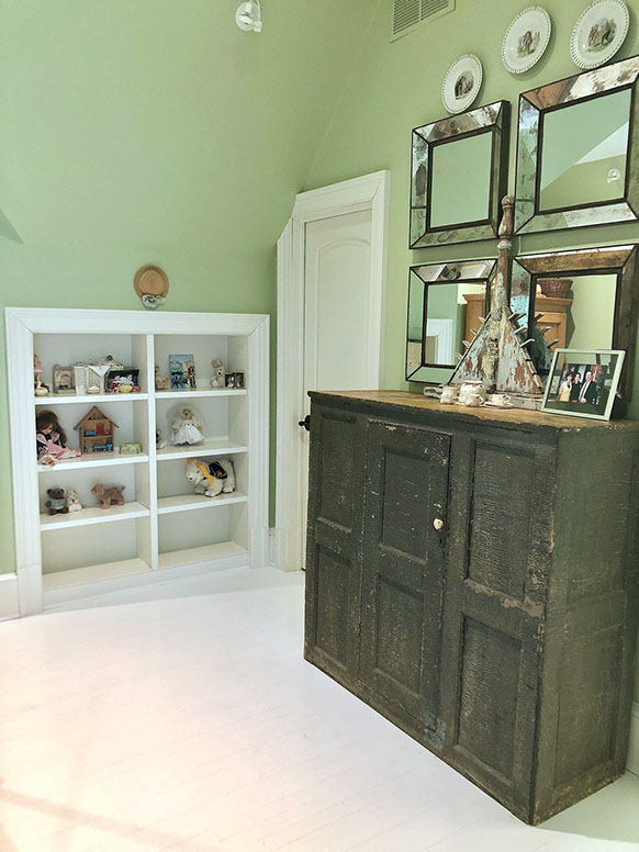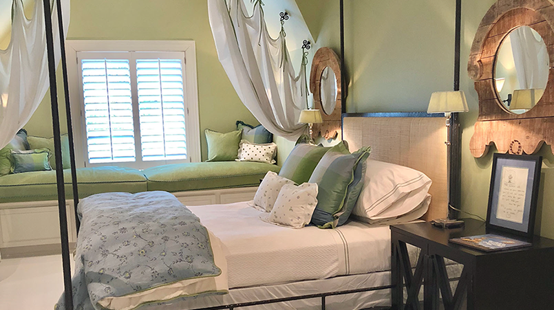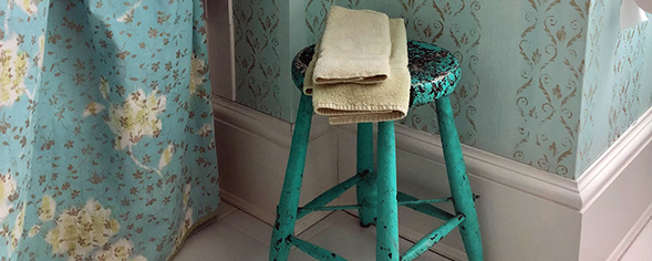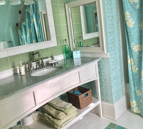 Painted white hardwood floors lend an inviting charm and showcase the iron framed bed and shabby chic decor. The bathroom is playful and clean with the patterned glass tiles and custom vanity and shower curtain.