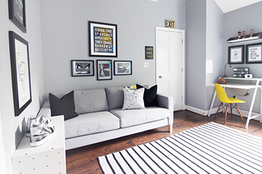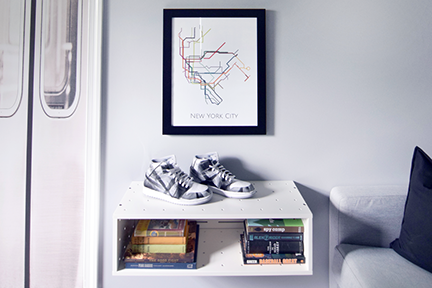 Bedroom designed for a 13-year old boy who wanted a NYC Subway inspired space. Must haves: oversized sofa for sleepovers, plenty of basketball "court space", and display space for sports collectibles.