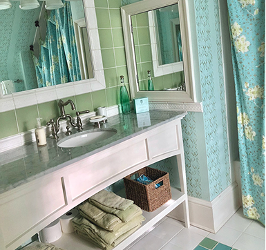 Painted white hardwood floors lend an inviting charm and showcase the iron framed bed and shabby chic decor. The bathroom is playful and clean with the patterned glass tiles and custom vanity and shower curtain.